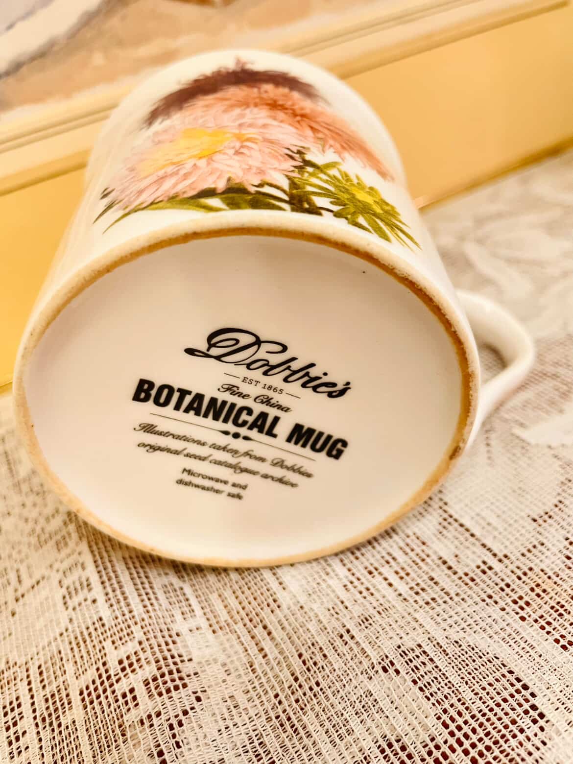 Softly romantic and delicately refined, this vintage floral porcelain mug captures the essence of an English countryside garden in full bloom. Featuring layered chrysanthemum-style blossoms in warm blush, peach, golden yellow, and deep burgundy tones, the design brings a graceful botanical presence to your tea or coffee ritual.