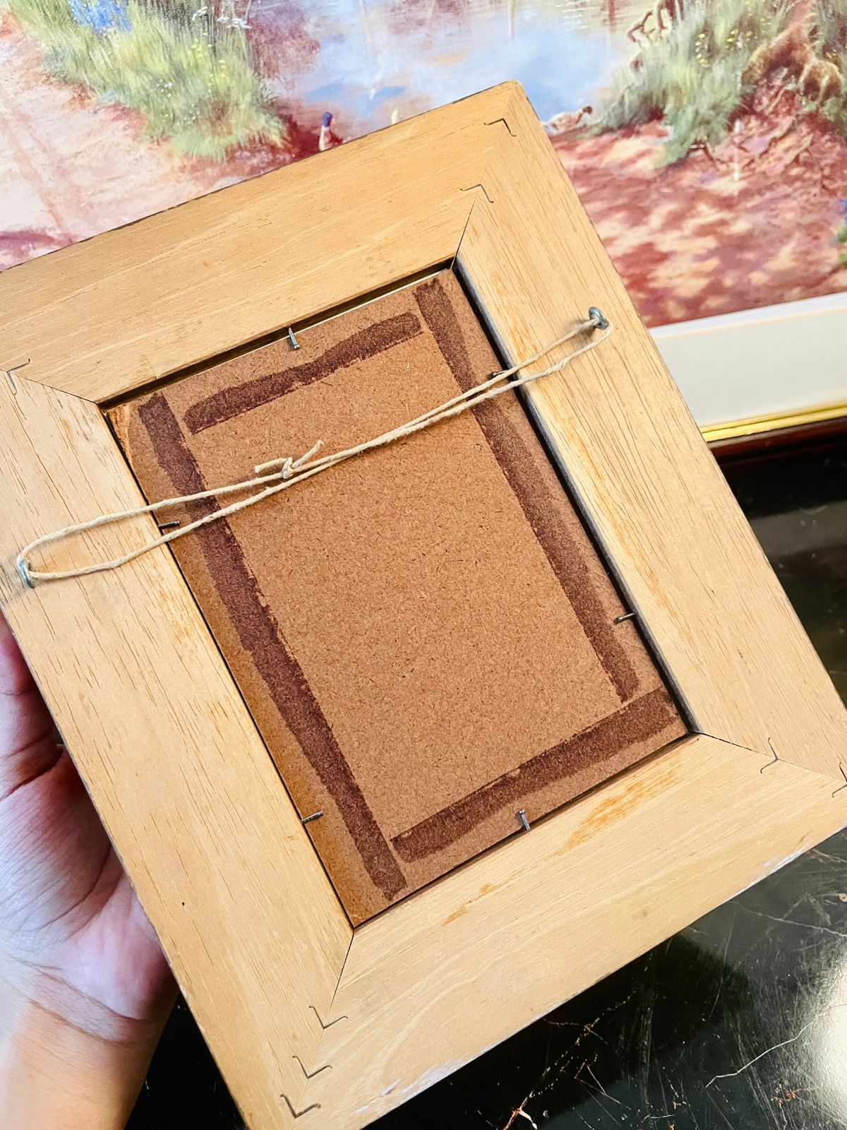 Frame: Dark wood frame with inner golden lining, string hanger at back