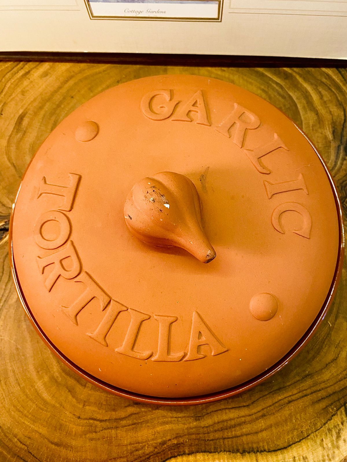 - Design: Round terracotta baker with domed embossed lid and garlic-shaped knob
