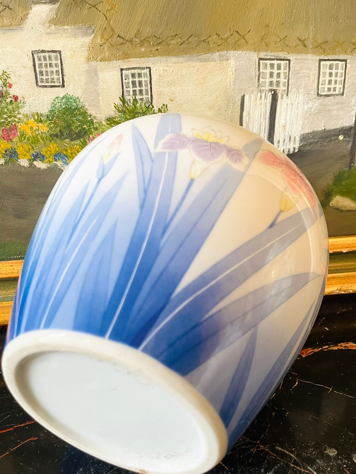 • Speciality: A beautiful vintage Japanese vase showcasing soft pastel florals in shades of lilac, blush, and sky blue. The design features hand-painted irises with gradient blue leaves, finished with a fine gold rim for a touch of luxury. Its rounded silhouette and subtle gloss make it an elegant blend of traditional craftsmanship and modern minimalism.