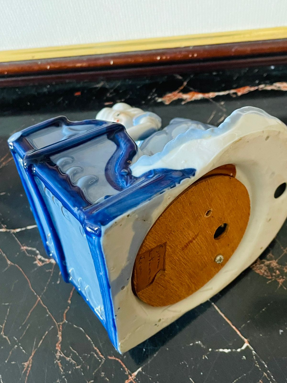 Speciality: Wind-up music box featuring a charming girl playing the piano in Victorian-style attire; hand-painted with delicate blue and gold accents