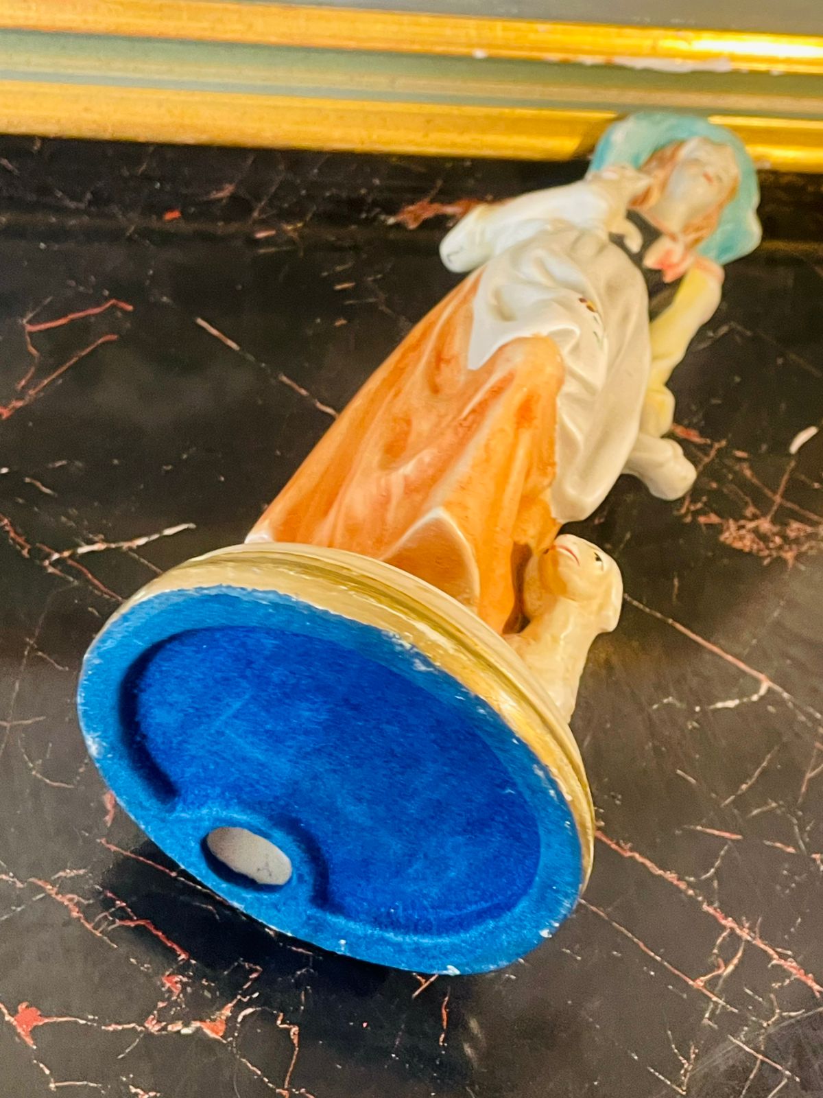 Design: Depicts a Victorian-style shepherdess holding a small lamb, with another at her feet