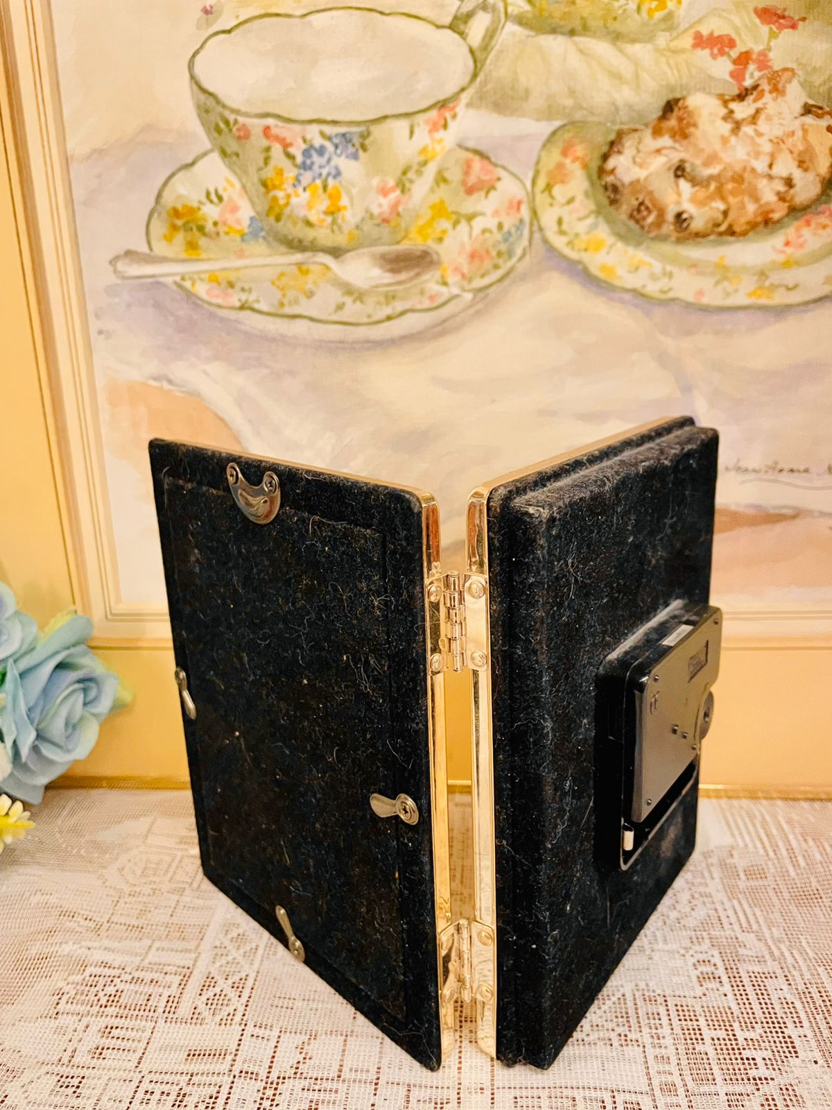 Design: Folding double-panel design featuring Roman numeral clock on one side and photo frame on the other