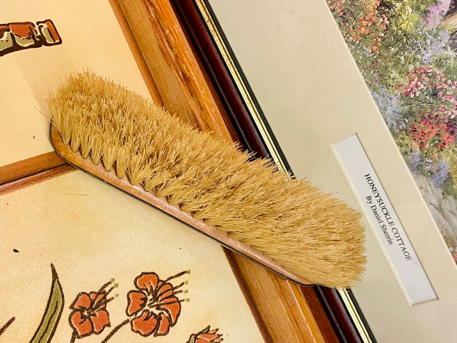Material:Metal frames, natural bristles, embossed guilloché-style pink backs.