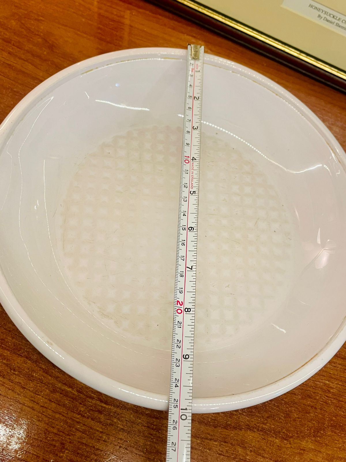 vintage Corning Vision frying pan or skillet made from revolutionary Pyroceramglass-ceramic material. The pan features the charming "Sweet Pea" floral pattern, which has pink and green illustrated vines.